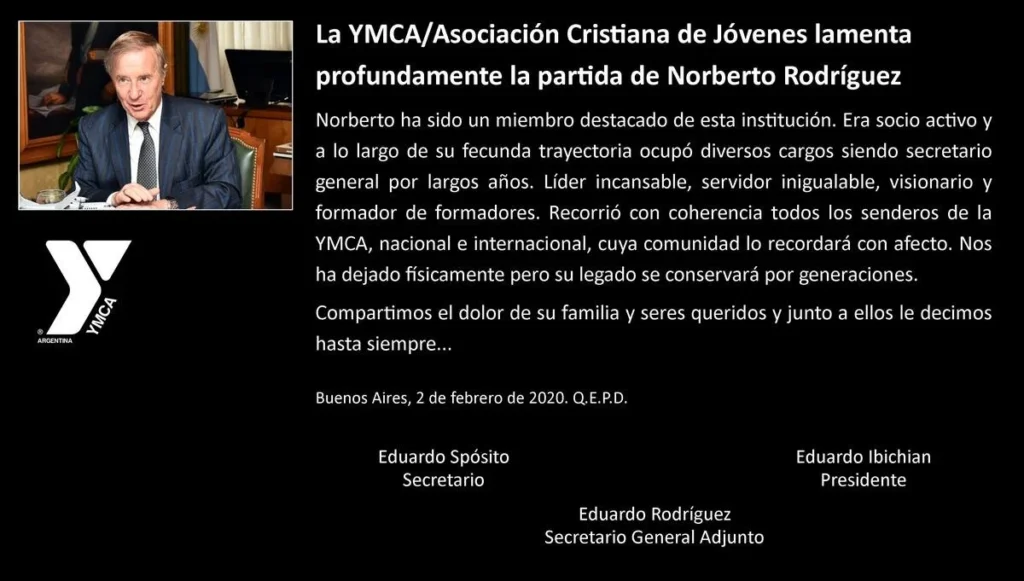 Con tristeza comunicamos el fallecimiento de Norberto Rodríguez, Secretario General de YMCA Argentina, el día de ayer a las 21:45 horas de Buenos Aires. Norberto fue un líder importante del movimiento latinoamericano y caribeño de YMCA y un referente de la sociedad civil organizada en Argentina.